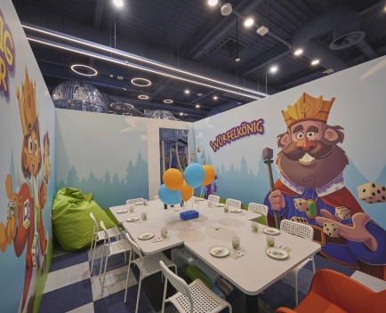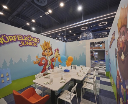 Dieser Geburtstagsraum wurde in Zusammenarbeit mit dem in Deutschland sehr beliebten Markenpartner HABA eingerichtet und steht ganz im Zeichen des Spiels „Der Würfelkönig“. Aktuell ist es unser einziger Raum, in dem wir den Tisch im original HABA-Design mit passenden Tellern und Bechern für euch eindecken.