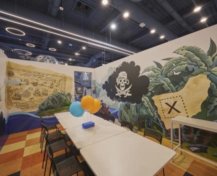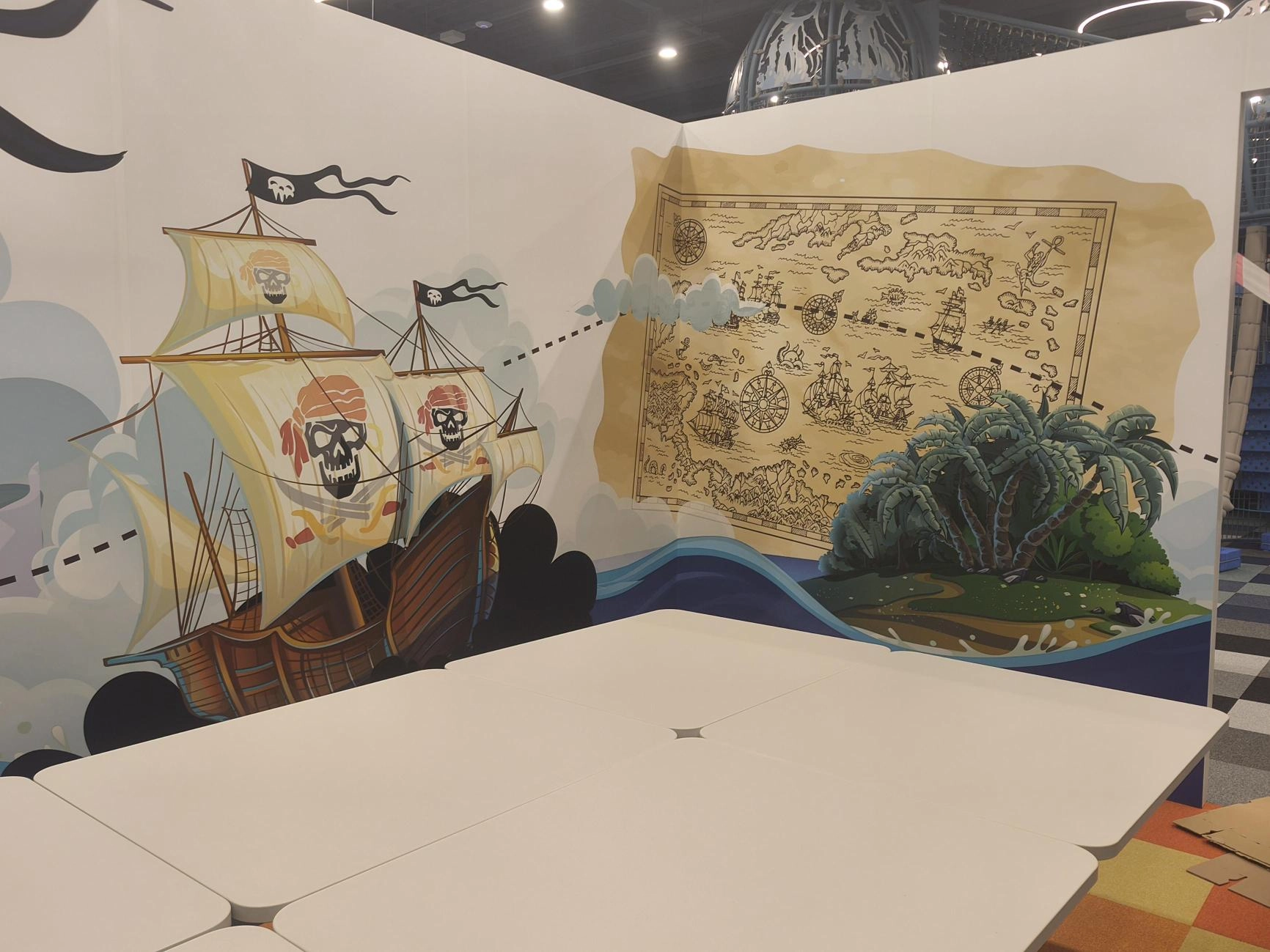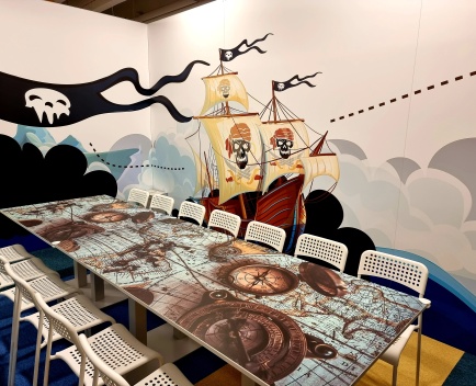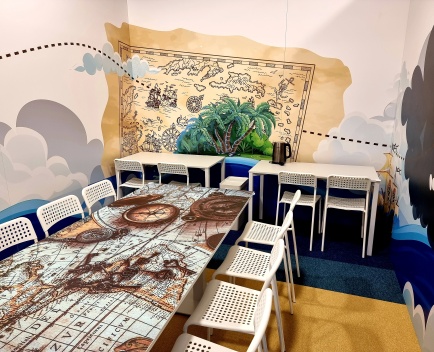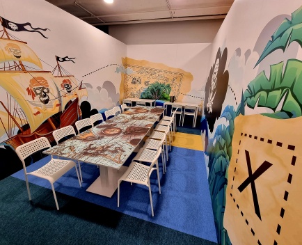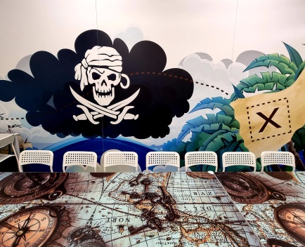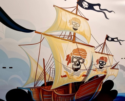 Ahoi, ihr mutigen Abenteurer! Willkommen in unserem Geburtstagszimmer mit Piraten-Thema – hier beginnt eure Reise über die sieben Weltmeere. Schon beim Betreten taucht ihr ein in eine fantasievolle Wandgestaltung: Auf den Tapeten erstrahlen Schatztruhen voller Gold, flatternde Piratenflaggen und geheimnisvolle Karten. So fühlt es sich an, als wärt ihr selbst Teil einer spannenden Schatzsuche!