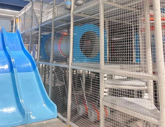 Eine Netzstruktur, die über dem Korridor hängt, mit schwebenden Netzen zum Klettern und Balancieren - ein einzigartiger Anblick, wenn Leute unter einem vorbeigehen.